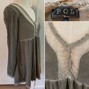 POL Gray Ribbed Long Sleeve Lace Blouse