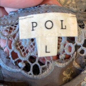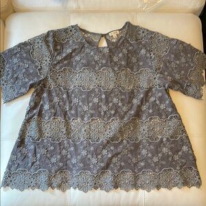 Beautiful grey lace blouse from POL, size Large. Features delicate floral embroidery throughout with scalloped lace trim on the sleeves and hemline. Button keyhole closure at the back. Lightweight and perfect for dressing up jeans or pairing with skirts for work or brunch.