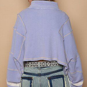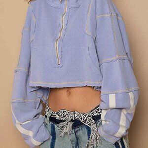 Turn everyday comfort into a statement with our POL Evening Blue Half-Zip Cropped Pullover. Designed in a soft waffle-textured knit, this top features an edgy exposed seam design with raw edges that give it a perfectly lived-in vibe. The relaxed, oversized sleeves and cropped hem bring a laid-back streetwear feel, while the bold half-zip neckline adds versatility—wear it zipped up for a cozy look or open for a casual, carefree style.