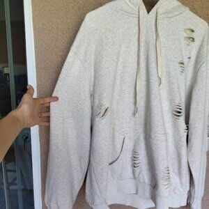 Distressed design: Intentional rips on front, back, sleeves, and hood