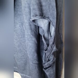 Relaxed fit blue distressed hoodie. Intentional distress throughout especially on elbow area. Perfect for casual wear.