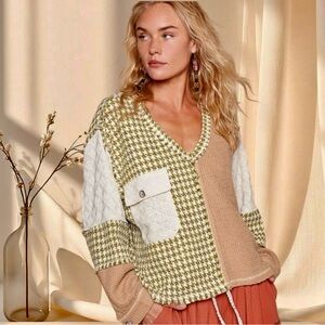 POL Houndstooth Sweater Two-Tone Knit Pullover with Pocket