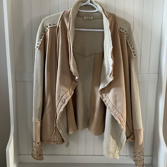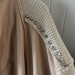Waffle knit/sweatshirt material with pyramid stud detail on shoulders and cuffs. Oversized a small fits up to a size 10. Boutique purchase. Only worn a couple of times.