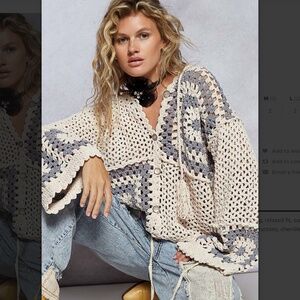Designed in V-neck, long sleeves, hooded drawstring, relaxed fit, out seam details, button closures, contrast hand knit square patterns, open knit constructons, chenille cardigan sweater.