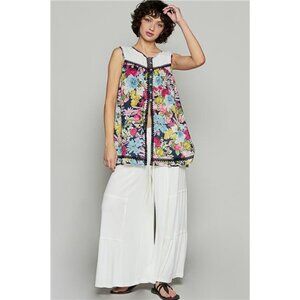 *This stunning bohemian-inspired sleeveless blouse features a vibrant multicolor floral print that captures the essence of summer fashion. Crafted from lightweight, breathable fabric, it offers exceptional comfort for all-day wear. The eye-catching design showcases pink, blue, yellow, and green florals against a dark background, enhanced by contrasting black trim and button details. The relaxed fit silhouette provides effortless style while the sleeveless design keeps you cool. Perfect for casual outings, vacation wear, or bohemian-chic styling, this versatile piece easily pairs with jeans, skirts, or layered over basics. The quality construction and artistic floral pattern make it a standout addition to any wardrobe.