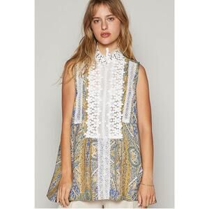 POL Lace Detail Frill Floral V-Neck Mock Neck Sleeveless Top Large Boho Flower