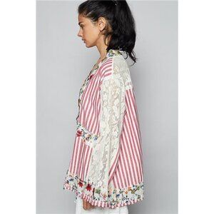 POL Lace Long Sleeve Striped Cardigan with Floral Patchwork Detail