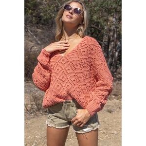 POL Light Coral Chenille Diamond Patterned Textured Knit Sweater