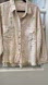 Distressed light tan/cream/peach jacket with button closure. Features chest pockets and frayed edges. Star design on back.