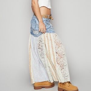 POL Light Wash Button Frayed Lace Floral Print Patchwork Maxi Skirt NWOT
