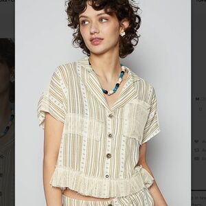 Designed in V-neck short sleeve regular fit jacket top in textured woven with out seam, front pocket, crochet patch, raw edge, vintage washing, stripe pattern.