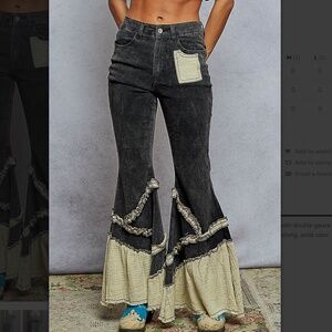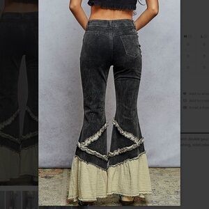 Designed in flared pants in stretchable denim/twill with double gauze reverse ruffle, overlocked edge point, raw edge, mini pocket point, vintage washing, solid color.