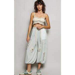 Designed in pants, relaxed fit in rib with crochet patch detail pointed lace contrast.