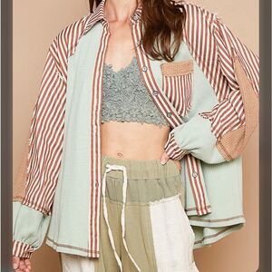 POL Mint and Brown Striped Button-Up Hoodie