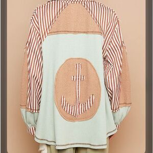 Stylish mint and brown hoodie with stripes. Features anchor patch on back. Button-up design with textured accents. Worn once, lost weight. This fits like an XL