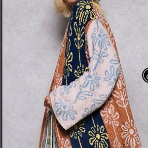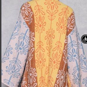 Textured open-front cardigan with bold floral panels. Relaxed fit for easy layering. Soft, chenille-like knit in contrasting colors.