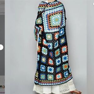 Vibrant crochet cardigan. Features multicolor pattern. Perfect for layering.