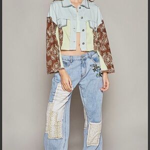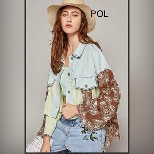 Stylish patchwork jacket by POL. Features a mix of light blue, brown, and cream. Button-up front with unique design.