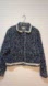 Stylish POL jean jacket with intricate texture. Features navy and cream colors. Perfect for a trendy look.