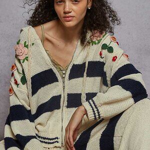 Designed hoodie zip up, balloon sleeve, relaxed fit top in chenille sweater with 3D embroidered detail pointed striped pattern.