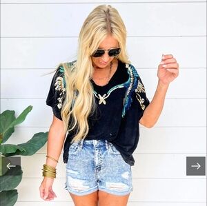Sparkle and shine brighter than the sun in this dazzling Embroidered Sequins & Bead Top-POL! Featuring a sparkly sequin design, oversized fit, and darling frayed detailing, you'll turn heads while keeping comfy and looking cute! Ready to add some flair to your wardrobe?! You've come to the right place.