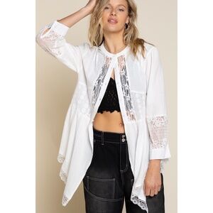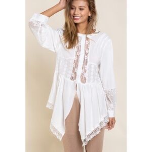 POL Off White Cotton & Lace Long Sleeve Unbalanced Hem Button Down Shirt