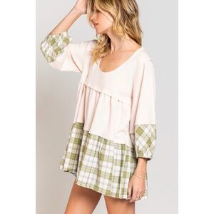 POL Olive & Cream Rib Knit & Plaid Scoop Neck Babydoll Tunic Top