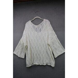 This is a POL Open Knit Oversized Cable Knit Sweater that is a size Large. It has 3/4 Belled Sleeves and is very Cottagecore. It is 100% Polyester. Laying flat, it measures: Armpit to armpit-25.5" and the Length is 30". Very pretty sweater and in great condition.