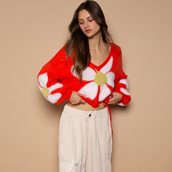POL Orange Ivory Contrast Faux Mohair Floral Pattern Sweater size M. NWOT beautiful POL cropped (adjustable cropped option) with Ptp 27”. Great spring look with white jeans. Easily can fit M-XL.