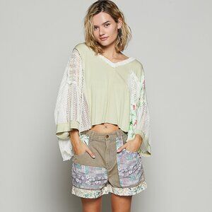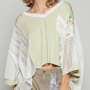 V-neck three-quarter sleeve oversized fit top in pol jersey with mixed media, crochet patch.