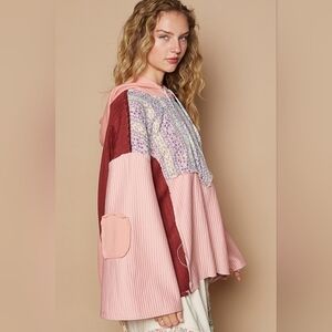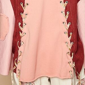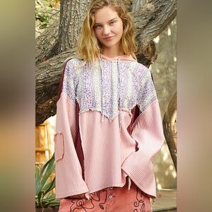 POL Oversized Patchwork Floral Sweatshirt, Flare Sleeves, in Pink And Purple, with ribbon ties down back.
