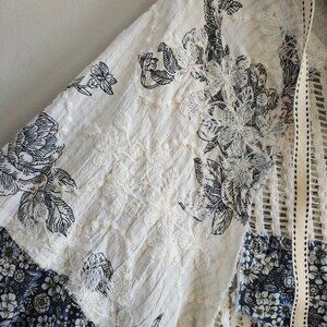 POL brand patchwork jacket. It features a unique bohemian aesthetic with a mix of floral print, lace panels, and textured woven fabric.