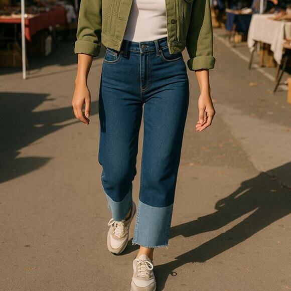 The raw hem and straight leg offer a modern, edgy look, while the two-tone denim and high-rise waist create a flattering silhouette.