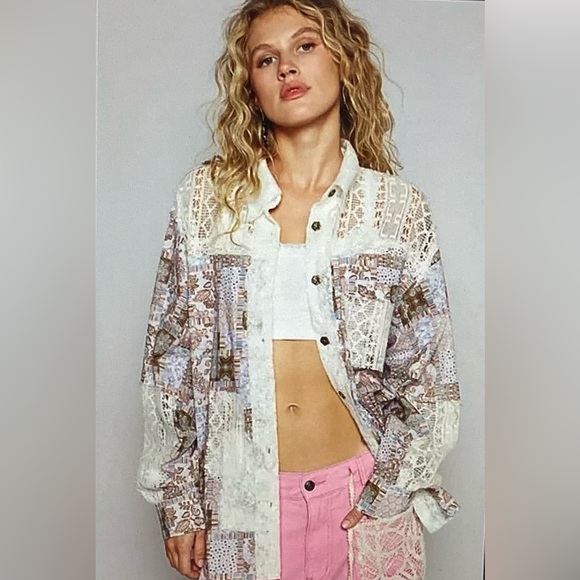 Elevate your style with this elegant patchwork lace button-up top. Featuring a blend of cream and brown tones, this top is perfect for any occasion. Pair it with your favorite jeans or skirt for a chic look.