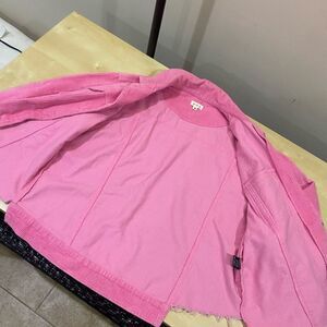 A vibrant pink denim jacket with a classic design, cuffed sleeves, and a slightly oversized fit.