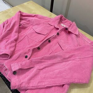 Anthropologie POL Womens Medium Denim Jacket Cropped Corduroy Pink Distress Fray