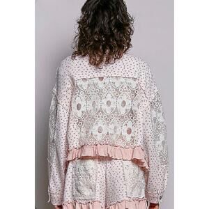Designed in a relaxed-fit balloon sleeve jacket top in printed knit. Featuring lace patch detailing, front flap pockets, and metal button-down closure, this piece blends soft structure with romantic texture. Finished with rayon gauze ruffle accents with raw edges and a mixed floral print, it offers a lightweight, layered look with a naturally lived-in feel.