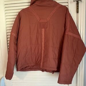 Elegant rust jacket with quilted design. Features a cozy high collar and practical front pockets.