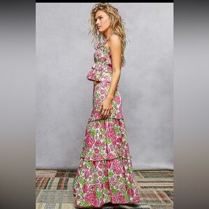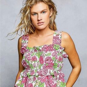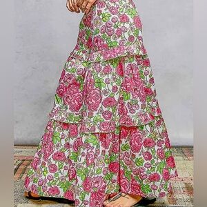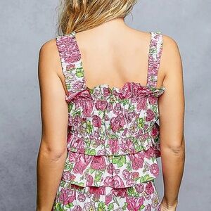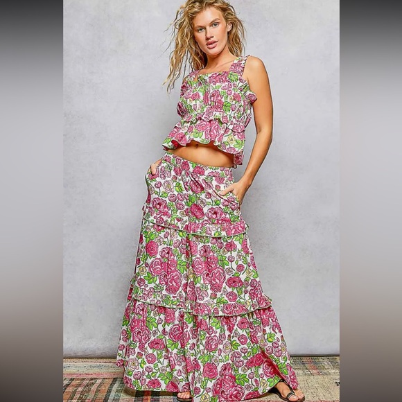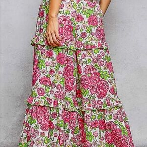 Gorgeous POL SET Wide-Leg Tiered Ruffle Edge Elastic Waist Floral Pants & A-Line Elastic Shirring Ruffle Floral Sleeveless Top