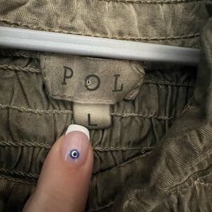 Stylish olive green POL NWOT sleeveless top with a textured design and ruffled sleeves.