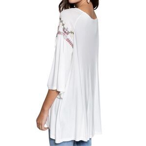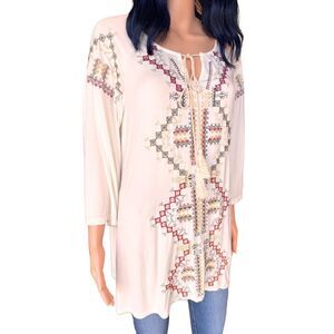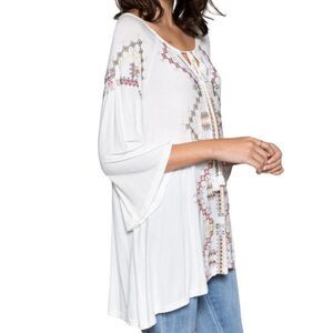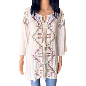 Cute, loose fitting white tunic with intricate multicolor embroidery. Features a tie-front detail with tassels. 3/4 bell sleeves, super soft and lightweight! Perfect for casual wear. Great with jeans and boots this fall!!