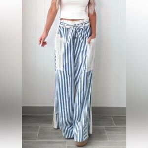 These striped pants are elevated with delicate lace details, adding a touch of femininity to your ensemble. Make a statement and turn heads with these eye-catching pants Color is White and blue Striped and ivory contrasting , just doesn’t show up on my camera. Would definitely fit a medium!