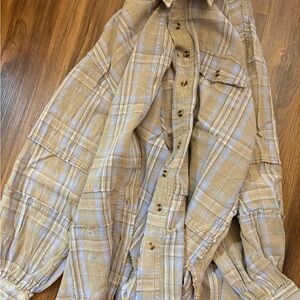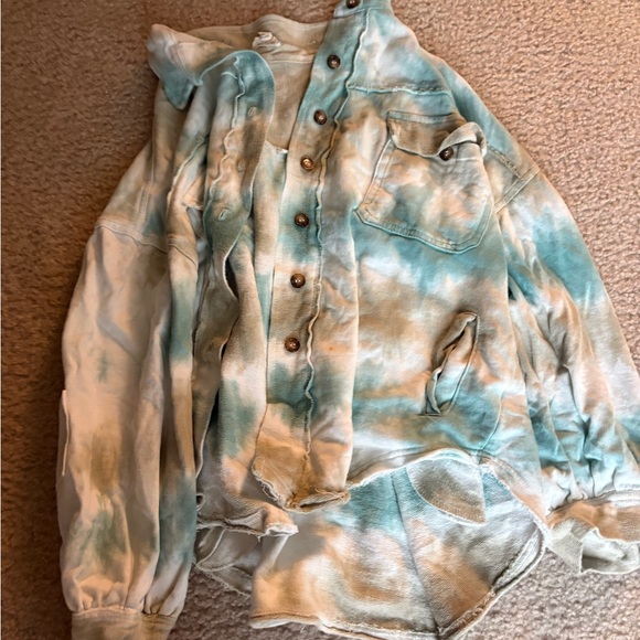 Stylish tie-dye button-up shacket. Features a blend of blue and tan colors. POL from a boutique in VA!