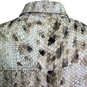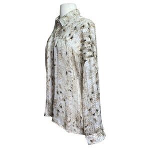 POL Sheer Button Front Blouse Tan and Gold Scale Print Medium