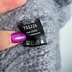 This POL women’s open-front cardigan features a soft, shimmery silver-gray knit with a cozy fuzzy texture and subtle sparkle. Lightweight yet warm, it’s perfect for layering in cooler seasons. Size Small. 100% polyester. Style TSS226.