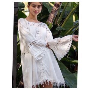 Simple Beauty Woven Tunic Dress Featuring pleats with see through Lace and Crochet on the body . Beautifully designed with square neckline , 3/4 sleeve and relaxed silhouette. Body is finished with Scallop lace Trim on Hem.