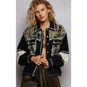 POL Size Medium Button Down Black Paisley Jacket Lace Detal Long Baloon Sleeve