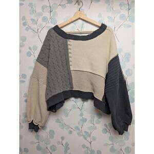 POL Size S Oversized Crop Sweater Chunky Patchwork Knit Cream Gray Neutral Cozy