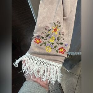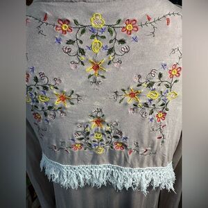 Beautiful open cardigan duster kimono top with embroidered floral detailing and fringe on the back, the pockets and the sleeves!