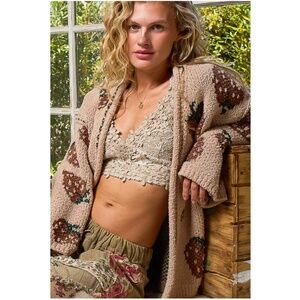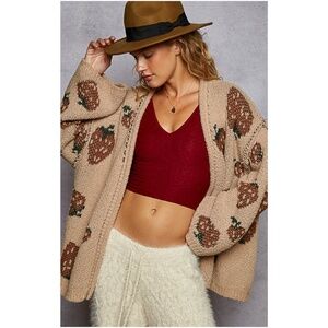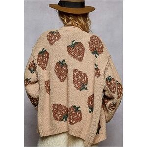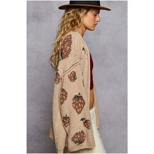 Designed in V-neck long sleeve roomy fit cardigan in Berber with varied fruit motif pattern and exposed seam detailing.